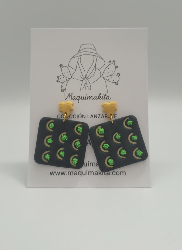 Estos pendientes son un homenaje a la ingeniería agrícola única de La Geria, donde la mano del hombre se alió con la fuerza volcánica para crear un viñedo sin igual. El diseño rectangular en negro intenso simboliza la capa de ceniza volcánica (picón) que cubre el suelo, reteniendo la humedad y protegiendo las raíces. Sobre este lienzo oscuro, un patrón de semicírculos amarillos y verdes recrea de forma abstracta la esencia del cultivo: